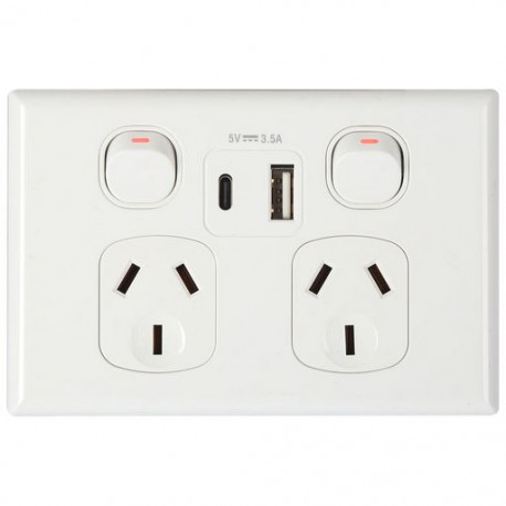 Double power point 10A power with 1x USB-A and 1x USB-C charging outlets (3.5A total).